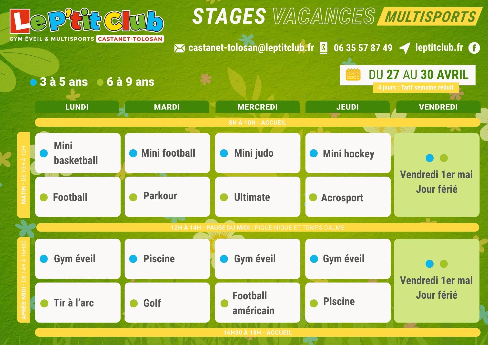 Nous proposons des activités sportives pour les enfants à Castanet-Tolosan durant les vacances de Pâques du lundi 20 au jeudi 30 avril 2026.