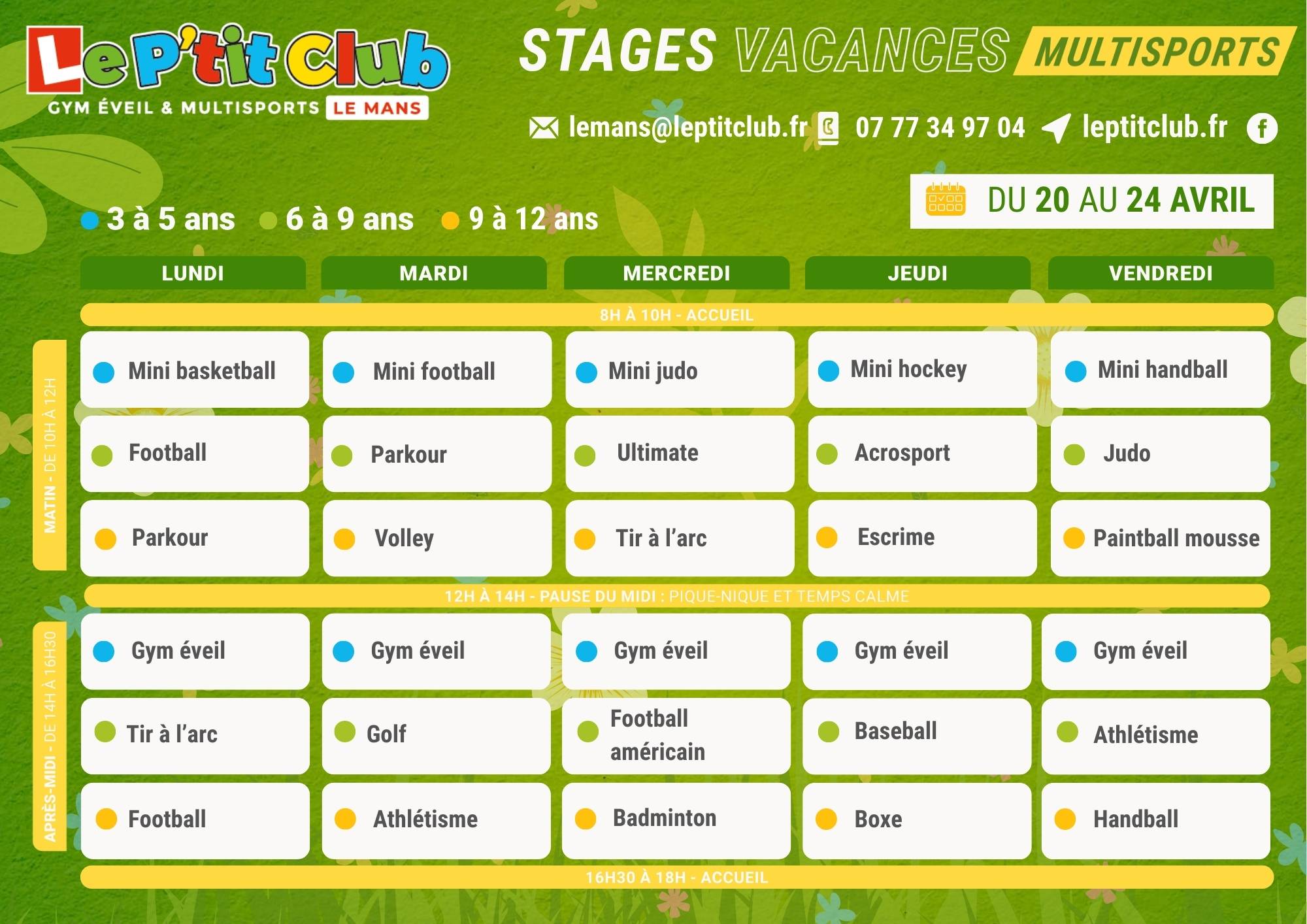 Nous proposons des activités sportives pour les enfants au Mans durant les vacances d’Hiver du lundi 13 au vendredi 24 avril 2026.