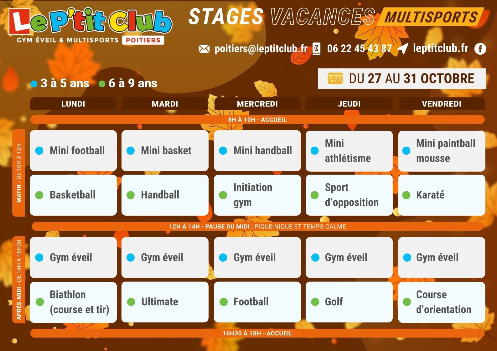 Nous proposons des activités sportives pour les enfants à Poitiers durant les vacances de la Toussaint du lundi 20 au vendredi 31 octobre 2025.