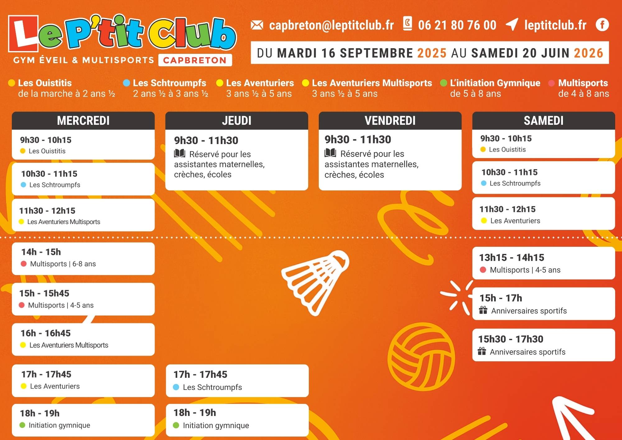 Votre interlocuteur Expert en sports de glisse, Bastien utilise son expérience pour encourager les enfants à explorer diverses disciplines sportives. Avec le sourire, il leur transmet les techniques du multisports et les plonge dans la magie du monde imaginaire. Nous proposons des activités sportives innovantes et variées pour les enfants de 1 à 12 ans. La gym éveil permet de développer la motricité dès le plus jeune âge et nous accompagnons ensuite les enfants vers un programme multisports conciliant l’apprentissage des disciplines et la pratique plus intense du sport. Le P’tit Club, des activités sportives à Capbreton pour les garçons et les filles en âge de marcher jusqu’à 12 ans. Document à remplir pour l’inscription Vous pouvez télécharger le document ci-dessous, le compléter et le transmettre à Matthias, le responsable du club. GRATUITE Gym éveil, multisports, initiation gymnique 1 séance d’essai gratuite à réserver, hors vacances scolaires, valable une seule fois 150 €soit 15 € / séance Abonnement gym éveil, multisports, initiation gymnique 10 séances à réserver, soit une séance par semaine sur 10 semaines consécutives, hors vacances scolaires 300 €*soit environ 9 € / séance Abonnement gym éveil, multisports, initiation gymnique 1 séance par semaine de septembre à fin juin, hors vacances scolaires : 32 séances * Le tarif du forfait annuel est dégressif et diminue tout au long de l’année entre septembre et juin. Nous proposons des activités sportives pour les enfants à Capbreton durant les vacances de Noël du lundi 22 décembre 2025 au vendredi 2 janvier 2026. Les enfants auront l’opportunité d’explorer une variété de sports de façon amusante à travers divers jeux organisés par les animateurs de l’équipe. Nous accueillons les enfants de 3 ans à 9 ans avec 2 tranches d’âge. Nous proposons des activités sportives pour les enfants à Capbreton durant les vacances scolaires d’Hiver. Les enfants vont pouvoir découvrir une multitude de sports d’une manière ludique grâce aux différents jeux mis en place par les éducateurs de l’équipe d’animation. Nous accueillons les enfants de 3 ans à 9 ans avec 2 tranches d’âge. Nous proposons un nouveau service qui aura lieu tous les mercredis hors vacances scolaires. Sous le même format que pour les stages vacances, les enfants vont pouvoir découvrir une multitude de sports d’une manière ludique grâce aux différents jeux mis en place par les éducateurs de l’équipe d’animation. Nous accueillons les enfants de 3 ans à 9 ans avec une seule tranche d’âge. Nous serons ouverts de 8h à 18h avec des activités qui commenceront à 10h et finiront à 16h30. Nous vous demandons d’amener le pique nique pour le midi, une bouteille d’eau ainsi qu’un petit goûter. Offrez-lui un anniversaire sportif grâce à notre formule P’tit Club. Vous aurez le choix parmi 15 activités comme le tennis, le judo, le basket, la gymnastique, le hockey, l’athlétisme, le football, le rugby… et bien d’autres ! Les anniversaires sont organisés par un éducateur sportif qui sera à la disposition de votre groupe exclusivement. Il préparera pour vous les deux activités choisies et vous permettra de découvrir les différent sports de manière ludique et en toute sécurité. Le P’tit Club