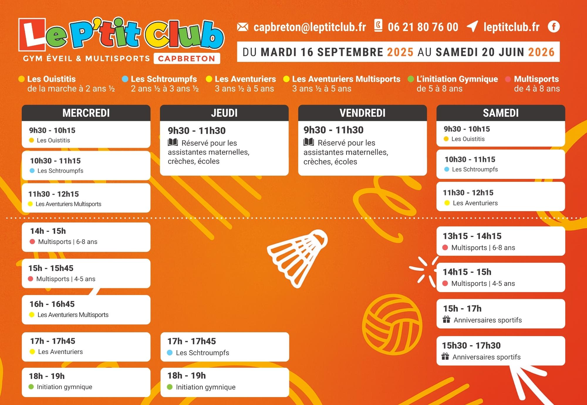 Votre interlocuteur Expert en sports de glisse, Bastien utilise son expérience pour encourager les enfants à explorer diverses disciplines sportives. Avec le sourire, il leur transmet les techniques du multisports et les plonge dans la magie du monde imaginaire. Nous proposons des activités sportives innovantes et variées pour les enfants de 1 à 12 ans. La gym éveil permet de développer la motricité dès le plus jeune âge et nous accompagnons ensuite les enfants vers un programme multisports conciliant l’apprentissage des disciplines et la pratique plus intense du sport. Le P’tit Club, des activités sportives à Capbreton pour les garçons et les filles en âge de marcher jusqu’à 12 ans. Document à remplir pour l’inscription Vous pouvez télécharger le document ci-dessous, le compléter et le transmettre à Matthias, le responsable du club. GRATUITE Gym éveil, multisports, initiation gymnique 1 séance d’essai gratuite à réserver, hors vacances scolaires, valable une seule fois 150 €soit 15 € / séance Abonnement gym éveil, multisports, initiation gymnique 10 séances à réserver, soit une séance par semaine sur 10 semaines consécutives, hors vacances scolaires 300 €*soit environ 9 € / séance Abonnement gym éveil, multisports, initiation gymnique 1 séance par semaine de septembre à fin juin, hors vacances scolaires : 32 séances * Le tarif du forfait annuel est dégressif et diminue tout au long de l’année entre septembre et juin. Nous proposons des activités sportives pour les enfants à Capbreton durant les vacances scolaires de la Toussaint. Les enfants vont pouvoir découvrir une multitude de sports d’une manière ludique grâce aux différents jeux mis en place par les éducateurs de l’équipe d’animation. Nous accueillons les enfants de 3 ans à 9 ans avec 2 tranches d’âge. Nous proposons des activités sportives pour les enfants à Capbreton durant les vacances de Noël du lundi 22 décembre 2025 au vendredi 2 janvier 2026. Les enfants auront l’opportunité d’explorer une variété de sports de façon amusante à travers divers jeux organisés par les animateurs de l’équipe. Nous accueillons les enfants de 3 ans à 9 ans avec 2 tranches d’âge. Nous proposons un nouveau service qui aura lieu tous les mercredis hors vacances scolaires. Sous le même format que pour les stages vacances, les enfants vont pouvoir découvrir une multitude de sports d’une manière ludique grâce aux différents jeux mis en place par les éducateurs de l’équipe d’animation. Nous accueillons les enfants de 3 ans à 9 ans avec une seule tranche d’âge. Nous serons ouverts de 8h à 18h avec des activités qui commenceront à 10h et finiront à 16h30. Nous vous demandons d’amener le pique nique pour le midi, une bouteille d’eau ainsi qu’un petit goûter. Offrez-lui un anniversaire sportif grâce à notre formule P’tit Club. Vous aurez le choix parmi 15 activités comme le tennis, le judo, le basket, la gymnastique, le hockey, l’athlétisme, le football, le rugby… et bien d’autres ! Les anniversaires sont organisés par un éducateur sportif qui sera à la disposition de votre groupe exclusivement. Il préparera pour vous les deux activités choisies et vous permettra de découvrir les différent sports de manière ludique et en toute sécurité. Le P’tit Club