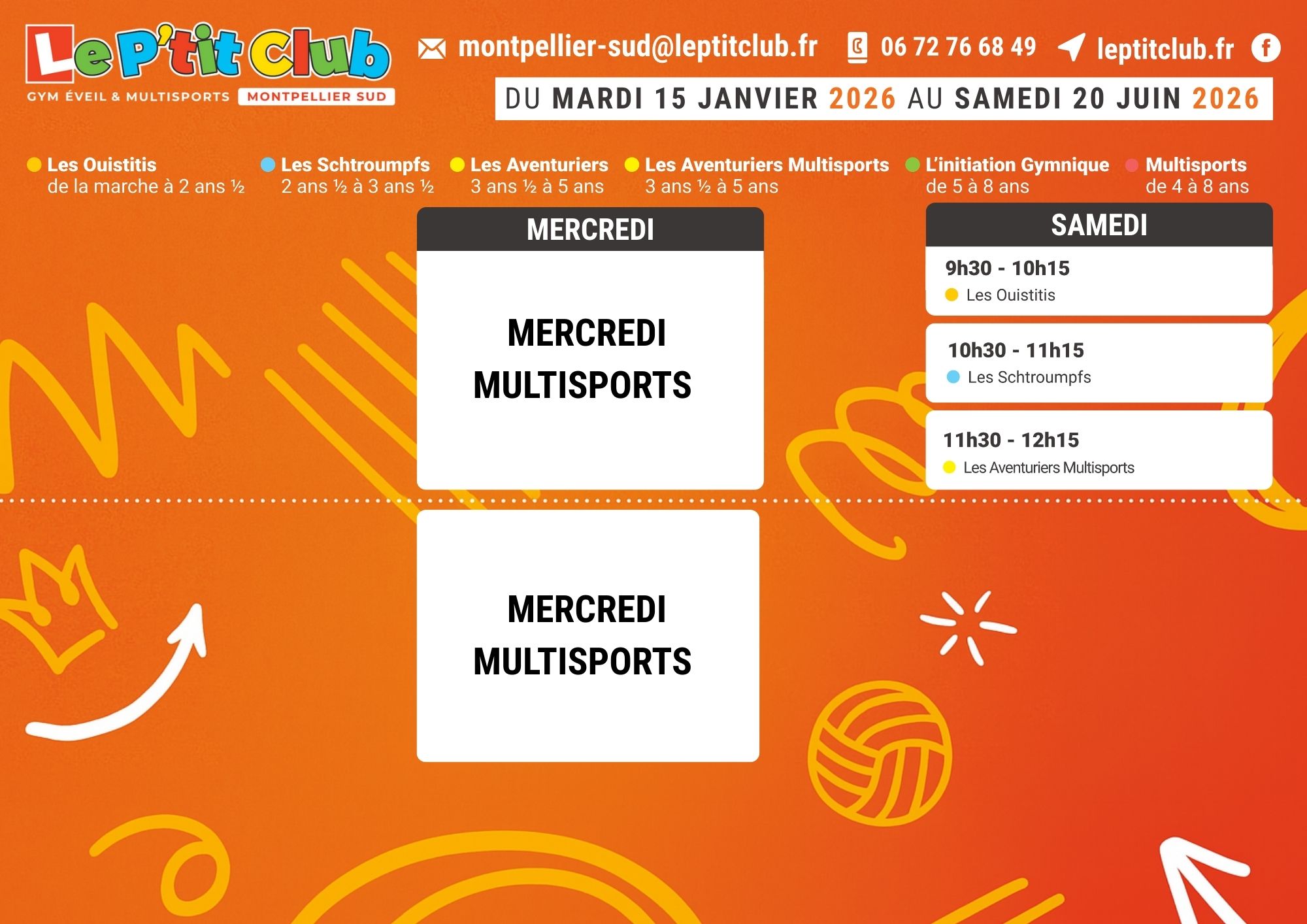 | Cours | Les Ouistitis – jusqu'à 2,5 ans, Les Schtroumpfs – de 2,5 à 3,5 ans, Les Aventuriers Multisports – de 3,5 à 5 ans |